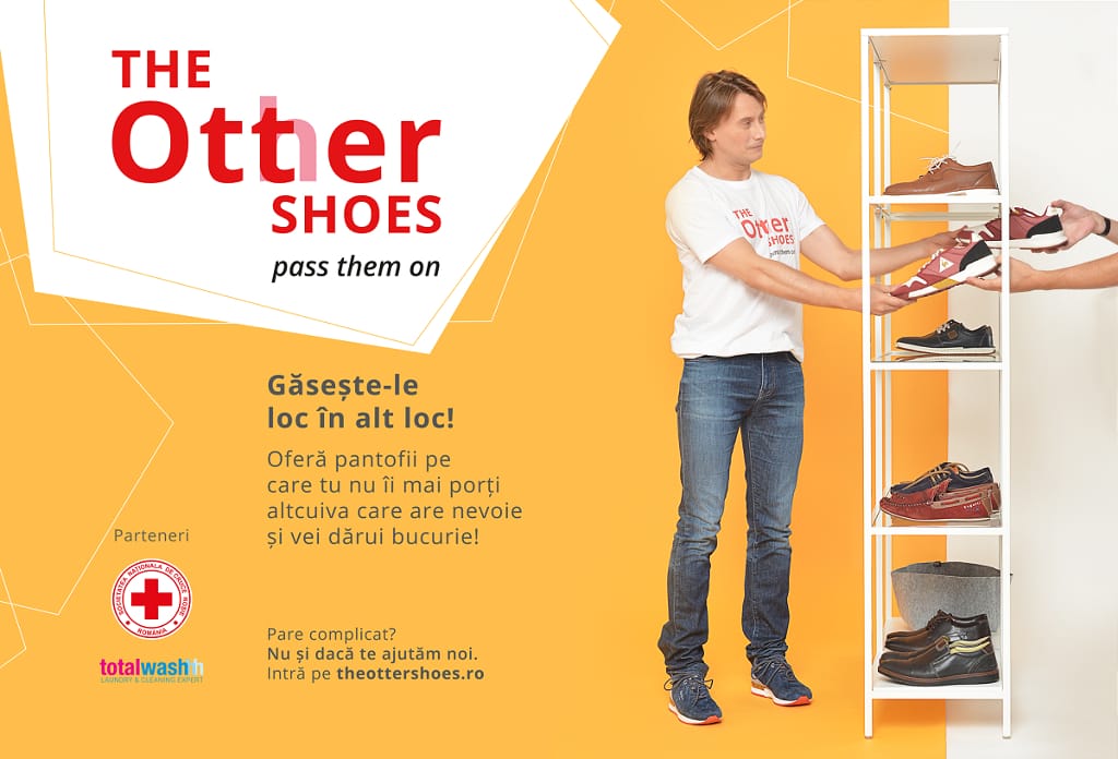 Sub umbrela “Pass them on – Dă-i (pantofii) mai departe” Otter a realizat un mecanism prin care clienții săi pot dona, fără niciun efort și gratuit, încălțămintea în stare bună care nu îi mai reprezintă sau pe care, pur și simplu, ajung să nu o mai poarte. Astfel, începând cu 6 august, orice comandă făcută pe otter.ro aduce la livrare un curier pregătit să preia un colet cu încălțăminte în stare bună, pentru a fi donată beneficiarilor Crucii Roșii Române. Pentru ca donațiile să ajungă la un număr cât mai mare de oameni, Otter pune la dispoziția fiecărui vizitator al site-ului opțiunea de a solicita un curier fără niciun cost, care să ajungă la el și să ridice o pereche de încălțăminte.
