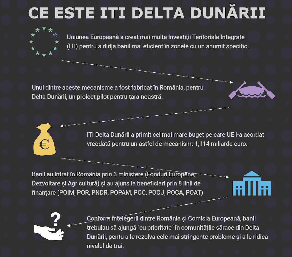 ISE a arătat într-o investigație transfrontalieră publicată în 2021 modul în care au fost cheltuiți 1,1 miliarde de euro fonduri europene alocate pentru dezvoltarea comunităților din Tulcea și Delta Dunării, prin mecanismul ITI.