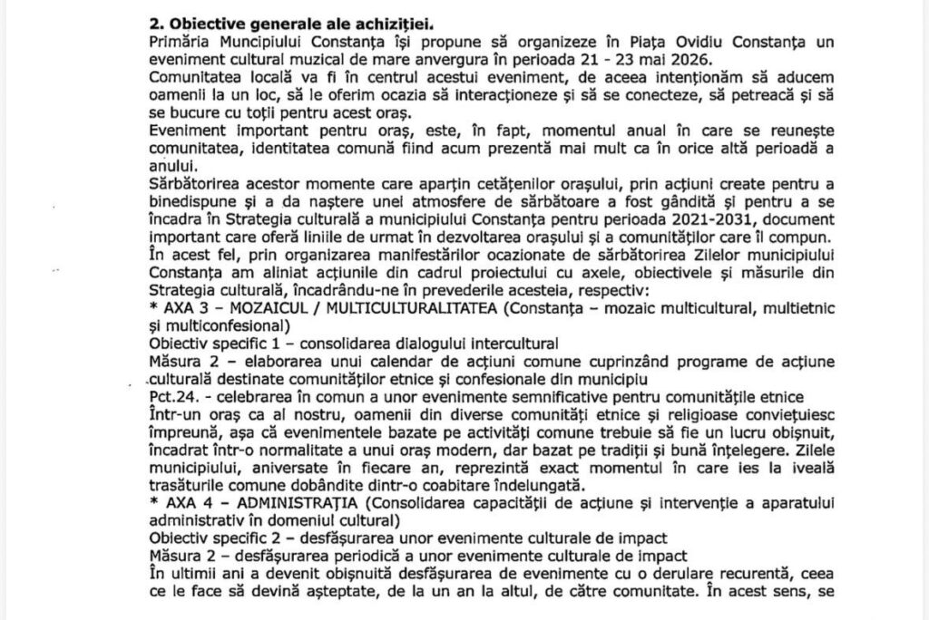 Recitalul fiecărui artist va avea o durată de minimum 1 oră, se arată în caietul de sarcini. „În situații obiective de neprezentare, cazuri de forţă majoră, se va oferi un artist similar ca gen muzical, notorietate şi preț cu cel cu care se înlocuieşte, numai cu acordul autorității contractante. Aceeaşi condiţie este valabilă și pentru prezentator”, mai scrie în document.