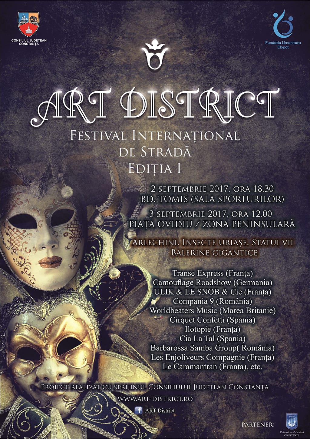Festivalul Internațional de Stradă ART DISTRICT 2017 este realizat de Fundația Umanitară Clopot cu sprijinul Consiliului Județean Constanța.