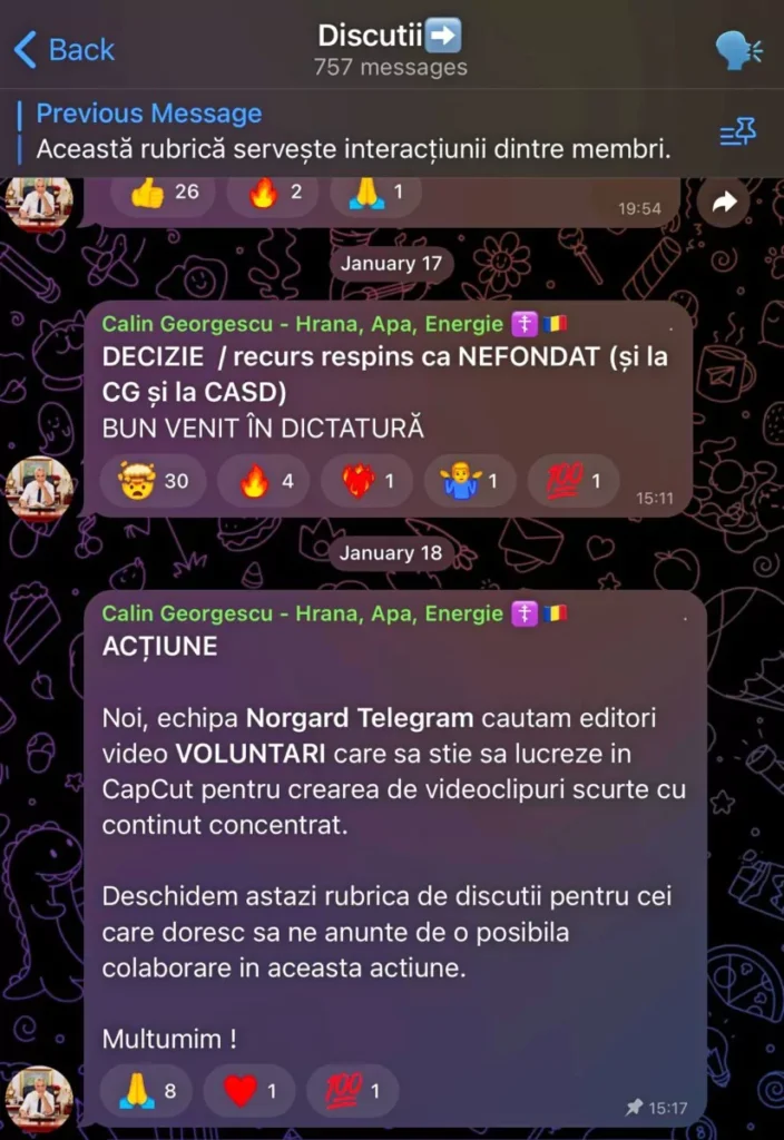 Un alt mesaj transmis pe grupurile de Telegram anunță că „echipa Norgard Telegram caută editori video voluntari care să știe să lucreze în CapCut (n. red. aplicație de editat videoclipuri) pentru crearea de videoclipuri scurte cu conținut concentrat”. Anunțul indică faptul că strategia grupului presupune crearea și distribuția unui volum mai mare de materiale video, cel mai probabil în scop de promovare, pe tiparul valului de clipuri și edituri propagate pe TikTok fără marcarea că sunt în scop electoral, în toamna anului trecut. Grupul a deschis și o „rubrică de discuții” pentru cei interesați de o posibilă colaborare.