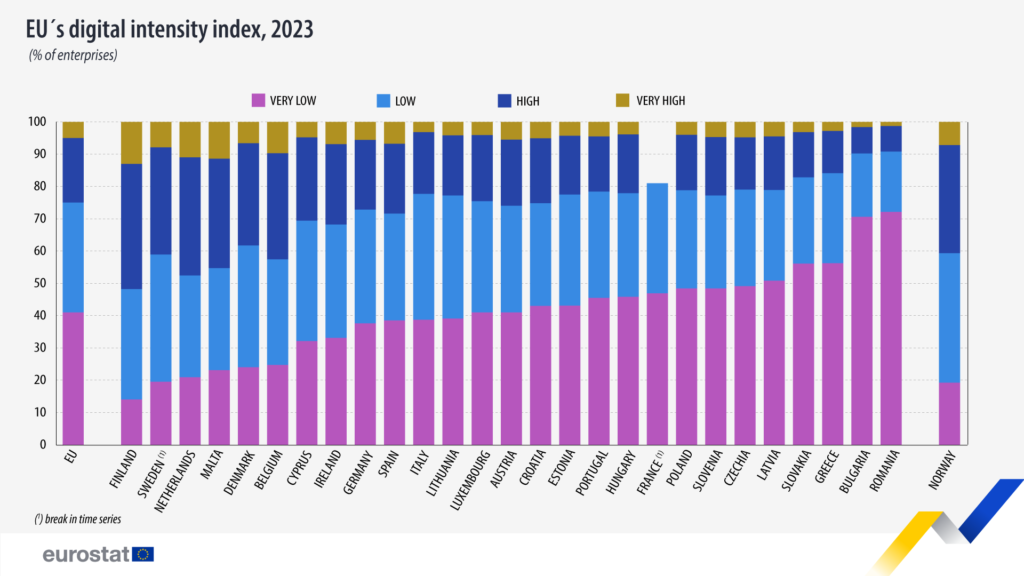 România are cel mai mare procent de companii slab digitalizate din Uniunea Europeană, respectiv 72,1%, conform Eurostat. La polul opus se află Țările de Jos, Malta și Finlanda.