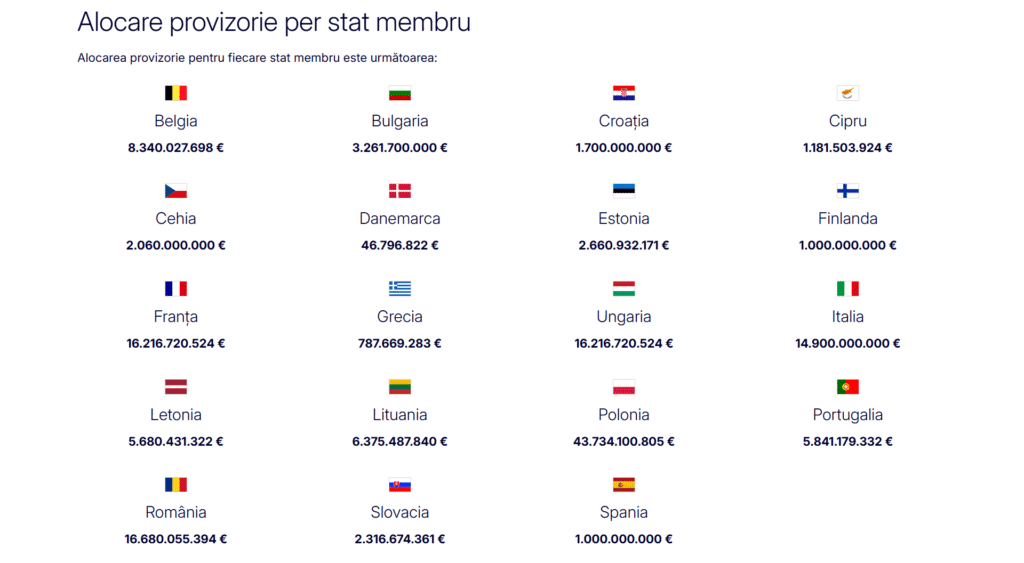 România va beneficia de 16,68 miliarde de euro finanțare prin mecanismul european Security Action for Europe (SAFE), potrivit alocărilor provizorii anunțate marți de Comisia Europeană pentru statele membre care au exprimat interesul pentru acest program, transmite Guvernul României, printr-un comunicat de presă. Este a doua alocare ca ordin de mărime stabilită astăzi de Comisie, anunță Executivul.