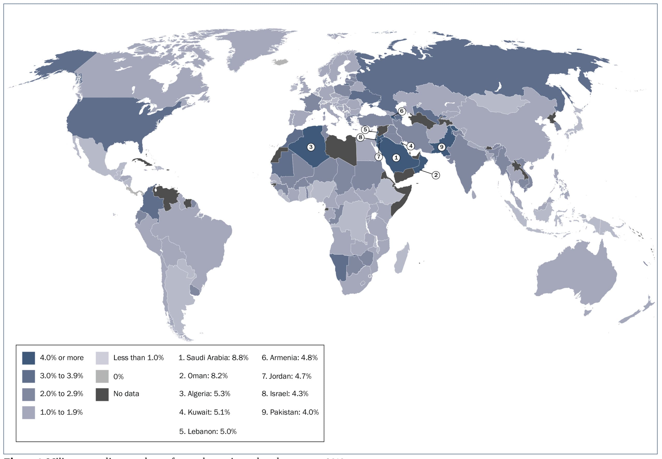 În Orientul Mijlociu, Israel a cheltuit anul trecut aproape 16 miliarde dolari (locul 17 mondial), cu doar 3 miliarde dolari mai mult decât Iran (13,2 miliarde dolari, locul 18 mondial). Israel are o populaţie de 8 milioane locuitori, în vreme ce în Iran locuiesc aproape 90 de milioane de suflete, de peste zece ori mai mult. Zona este incontestabil dominată de Arabia Saudită, cu cheltuieli de 67,6 miliarde dolari în 2018 (3,7% din totalul mondial), a treia forţă din clasamentul mondial militar.
