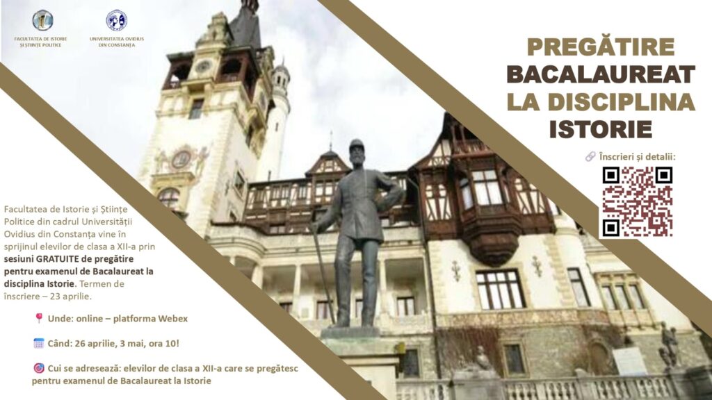 Facultatea de Istorie și Științe Politice (FISP) din cadrul Universității Ovidius din Constanța (UOC) organizează două ședințe gratuite de pregătire la disciplina Istorie, pentru examenul de Bacalaureat 2025, conform unui comunicat de presă al universității.