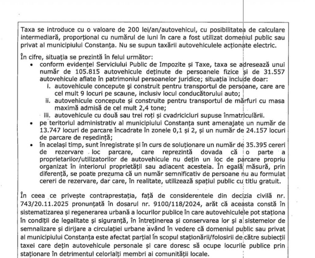 743/20.11.2025 pronunţată în dosarul nr. 9100/118/2024, arăt că aceasta constă în sistematizarea şi regenerarea urbană a locurilor publice în care autovehiculele pot staționa în condiţii de legalitate şi siguranţă, în întreținerea şi conservarea lor şi a sistemelor de semnalizare şi dirijare a circulației urbane având în vedere că domeniul public sau privat al municipiului Constanţa este afectat parțial în scopul staţionării/folosirii de către subiecţii taxei care deţin autovehicule personale şi care doresc să ocupe locurile publice prin staționare în detrimentul celorlalți membri ai comunității locale”, se mai arată în proiectul de hotărâre.