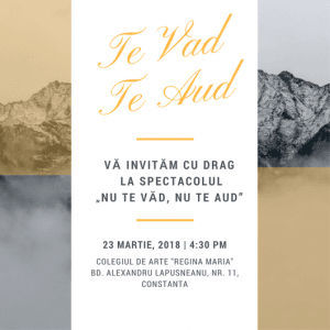 Asociaţia Împreună pentru Viitor Constanţa vă invita vineri, 23 martie 2018, ora 16:30, la Colegiul de Arte ”Regina Maria”, să luați parte la spectacolul „NU TE VĂD, NU TE AUD”, organizat de elevii din 9 școli constănțene înscrise în proiectul „TE VĂD, TE AUD”.