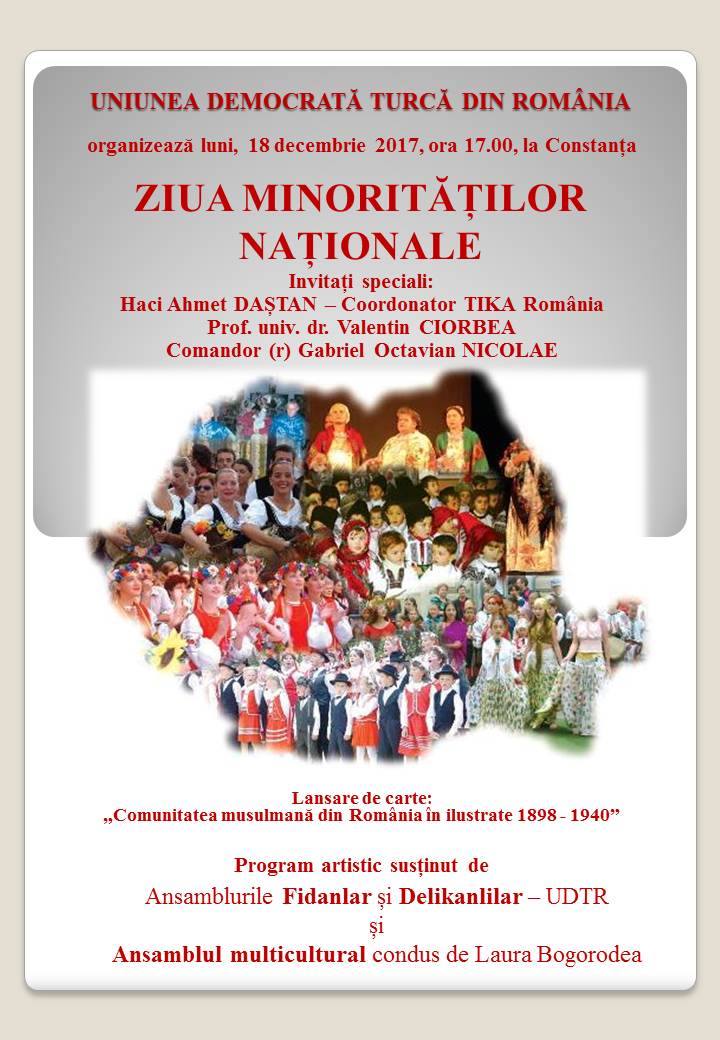 Uniunea Democrată Turcă din România organizează luni, 18 decembrie 2017, începând cu ora 17.00, la Constanţa, o manifestare cultural-artistică prilejuită de Ziua Minorităţilor Naţionale din România, instituită prin lege în acest an ca sărbătoare naţională.