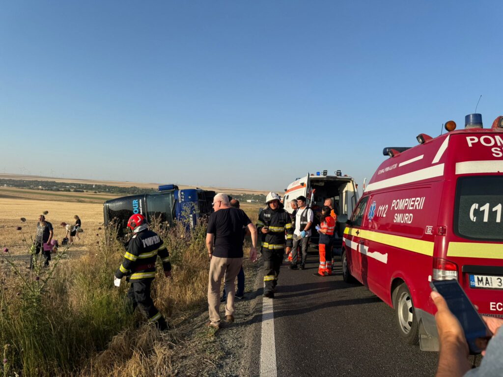 UPDATE 19:15 În autocar se aflau 55 de persoane: 37 de femei, 9 copii și 8 bărbați. Patru persoane sunt monitorizate, refuzând transportul, potrivit ISU Dobrogea.