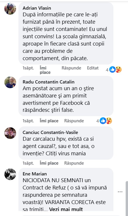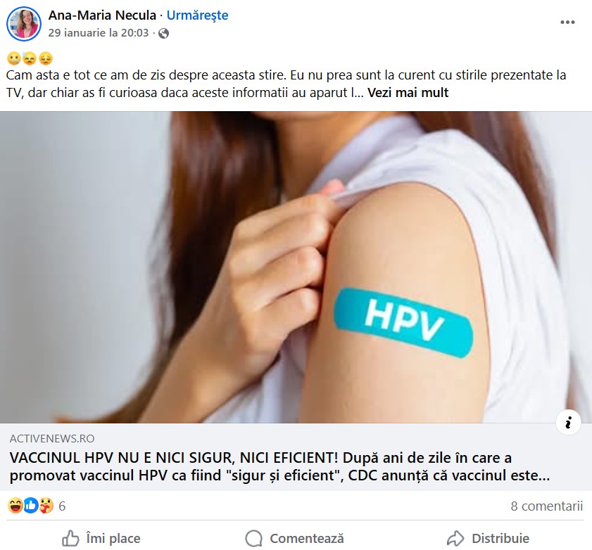 De peste o săptămână, site-ul conspiraționist ActiveNews ventilează propagandă despre cum „vaccinul anti-HPV nu este sigur, nici eficient”, în baza unui articol care interpretează greșit rezultatele unui studiu medical publicat în 2024, în Columbia. Dezinformarea ActiveNews, preluată de la conspiraționiștiii din SUA, a fost folosită pe Facebook de doi medici antivacciniști cu zeci de mii de urmăritori în „cruciada” lor împotriva Colegiului Medicilor care îi „hărțuiește” după ce au participat la o conferință pseudo-științifică de la Brașov.
