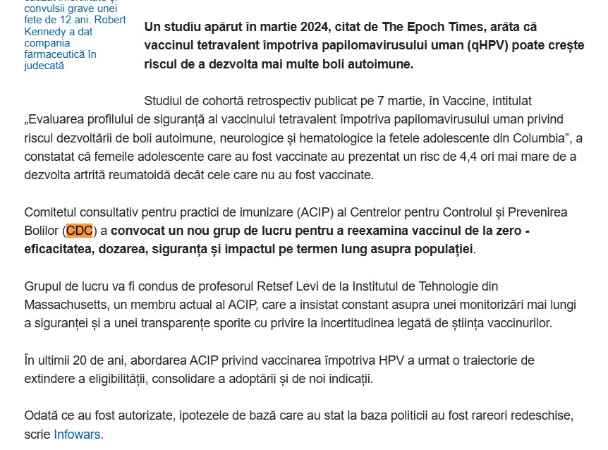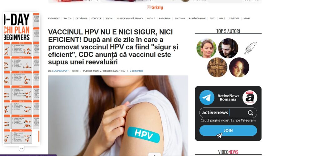 La finalul lui ianuarie, în timpul Săptămânii Europene de Prevenire a Cancerului de Col Uterin, site-ul ActiveNews publica un articol cu titlul “Vaccinul HPV nu e nici sigur, nici eficient! După ani de zile în care a promovat vaccinul HPV ca fiind „sigur și eficient”, CDC anunță că vaccinul este supus unei reevaluări”.