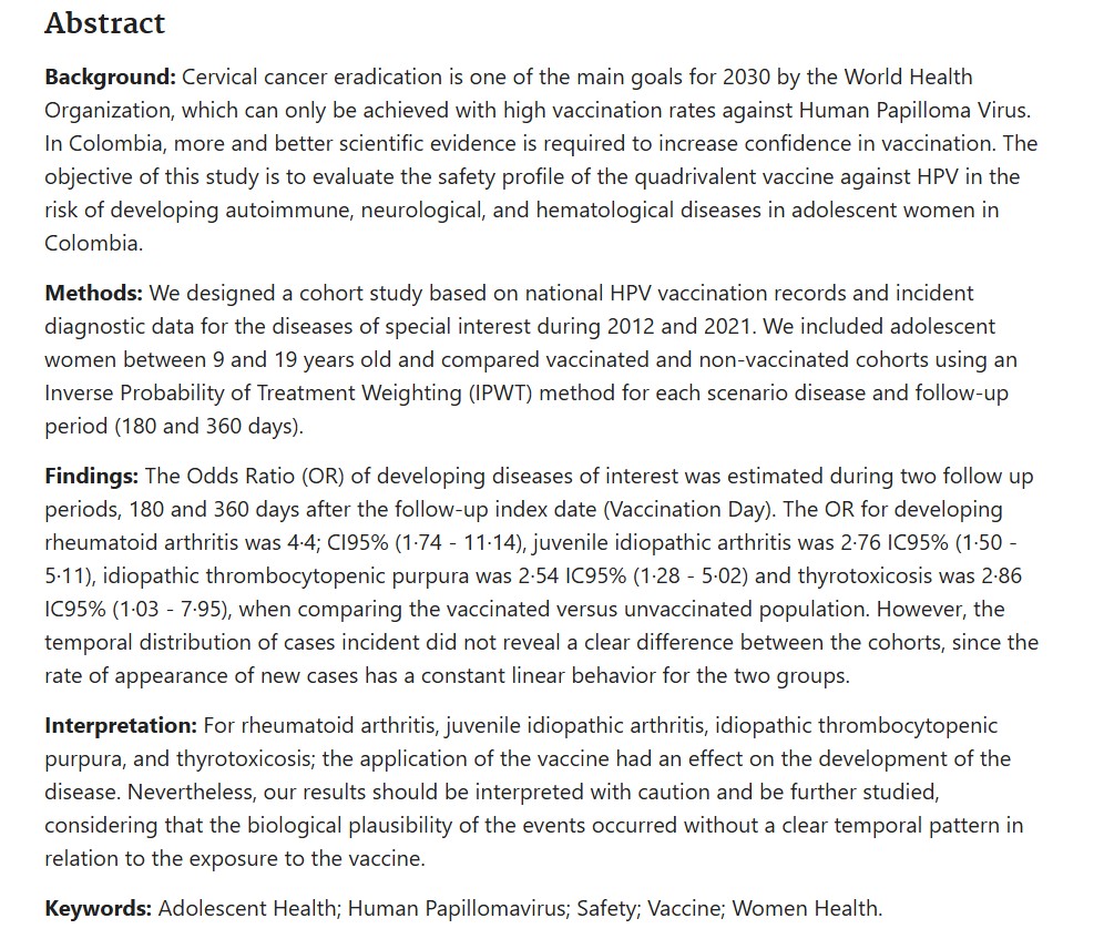 - „Eradicarea cancerului de col uterin este unul dintre obiectivele principale stabilite de Organizația Mondială a Sănătății pentru anul 2030, obiectiv care poate fi atins doar prin rate ridicate de vaccinare împotriva virusului papiloma uman (HPV). În Columbia, este nevoie de dovezi științifice mai numeroase și de o calitate mai bună pentru a crește încrederea în vaccinare.”