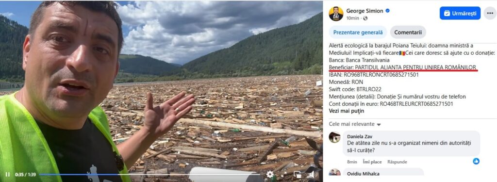 George Simion cere donații în contul partidului extremist AUR după inundațiile din Suceava, prin două postări pe Facebook, din 30 iulie și 1 august. În postarea de miercuri, Simion le cere oamenilor ”obligatoriu” CNP și numărul de telefon dacă vor să doneze și subliniază că ”donatorii trebuie neapărat să fie cetățeni români”.
