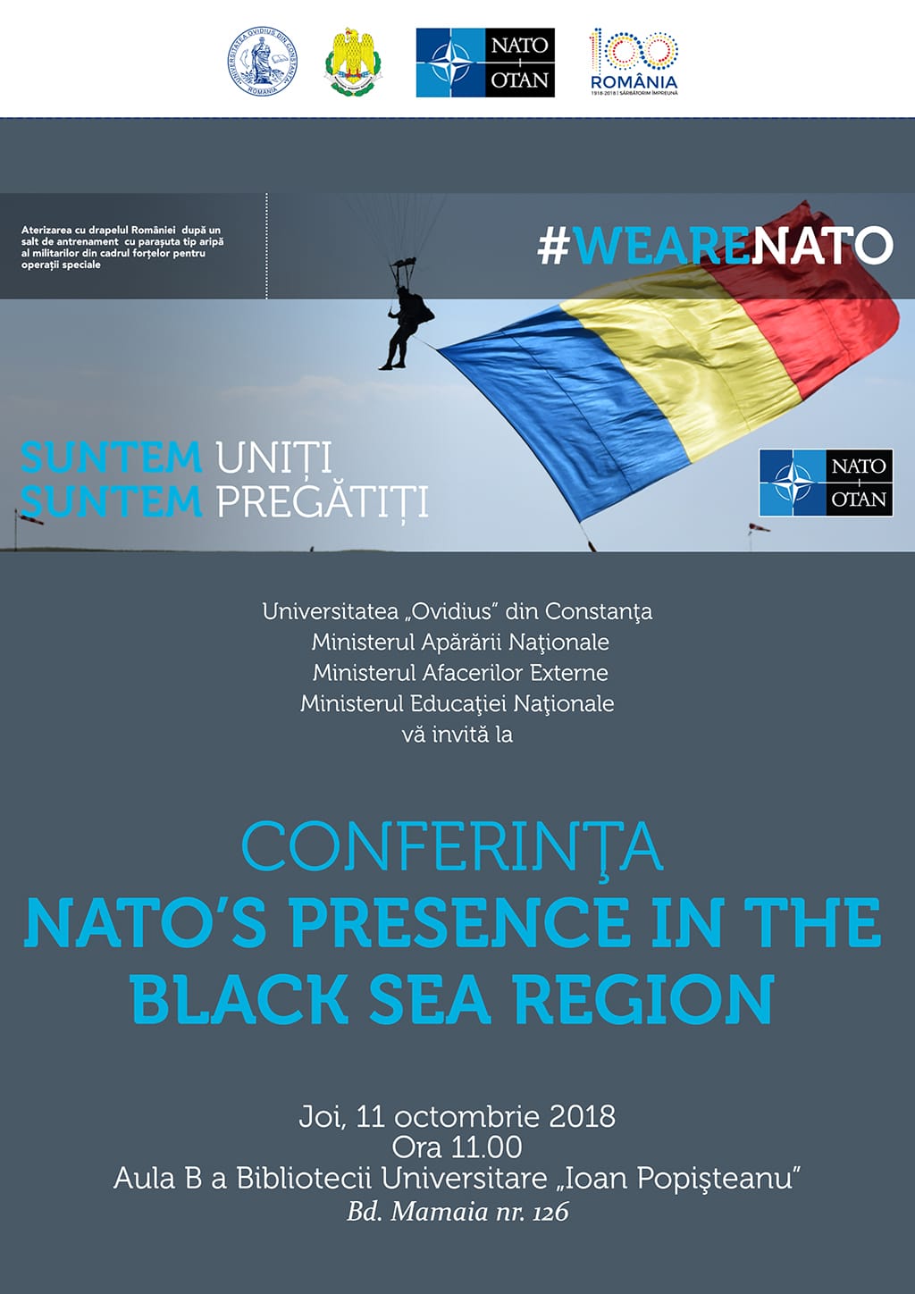 Universitatea „Ovidius” din Constanța (UOC) va găzdui joi, 11 octombrie 2018, începând cu ora 11.00, conferința „NATO’s presence in the Black Sea region” organizată în parteneriat cu Ministerul Apărării Naționale, Ministerul Afacerilor Externe și Ministerul Educației Naționale. Evenimentul va avea loc la Aula B a Bibliotecii Universitare „Ioan Popișteanu” a UOC, corp nou, etaj I, Bd. Mamaia nr. 126.