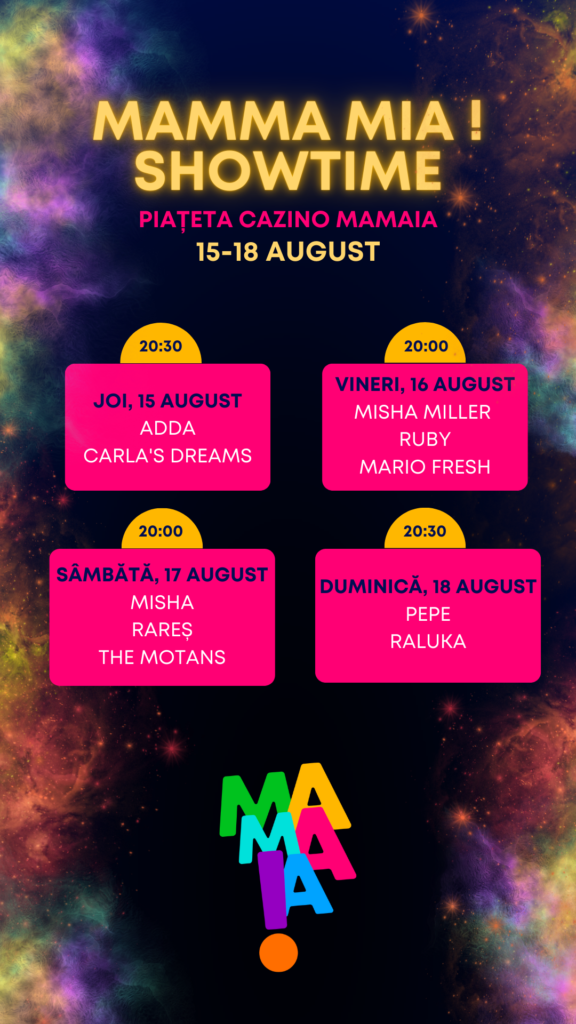 • Scena Mamma Mia din Piațeta Cazino Mamaia: Zilnic, înceând cu joi, 15 august, scena va găzdui concerte electrizante cu artiști de top. Atmosfera va fi una incendiară, cu muzică live și show-uri care vor ține publicul în priză până târziu în noapte: